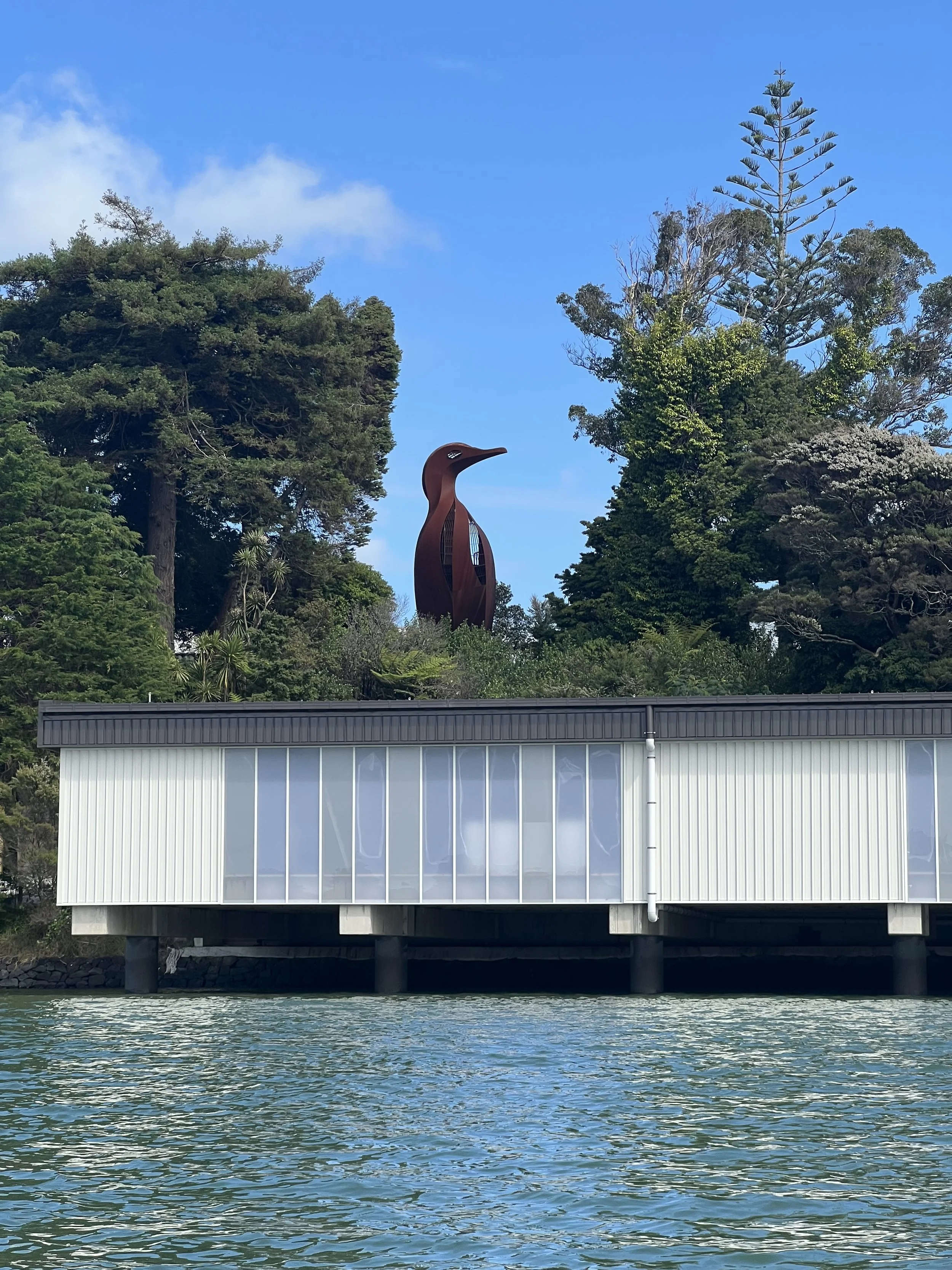 Te Kanohi o Te Manu (The Eye of the Bird) – the 10m high corten steel sculpture of a pied shag, settling into her nest at Harrier Point Park watching over our project.